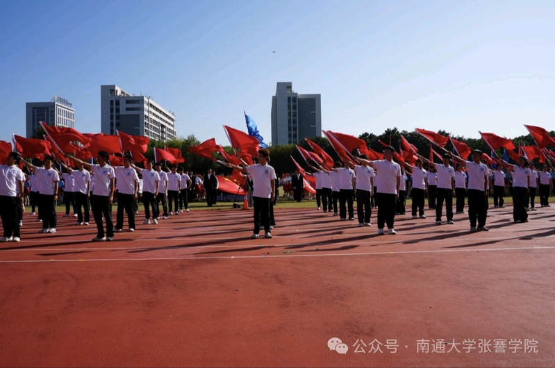 10月24日上午8时,开幕式在激昂豪迈的《运动员进行曲》中拉开帷幕。英姿飒爽的护旗方阵,以挺拔的姿态护送国旗、校旗、运动会会旗依次入场,那一抹抹鲜红与庄重,瞬间点燃全场热血。随后,各学院方阵精彩入场。张謇学院尽管人数不多,仍然努力组建了66人的方阵出场。大家身着印有学院logo的白色T恤,迈着铿锵有力的步伐,喊着掷地有声的口号闪亮登场。他们的每一步都彰显着学子们的昂扬斗志,每一声呼喊都饱含着对运动荣耀的无限憧憬。 在《精忠报国》激昂的音乐旋律中,同学们有力地挥舞着红旗,尽情传递着“承张謇志、筑强国梦”的豪迈情怀。 红色旗帜如燃烧的火焰,在蓝天与楼宇的映衬下,漾开青春与活力的交响;红旗翻飞间,队员身姿灵动,似红蝶蹁跹,将运动会的激情与朝气,在这一帧帧画面里燃成绚烂诗行。