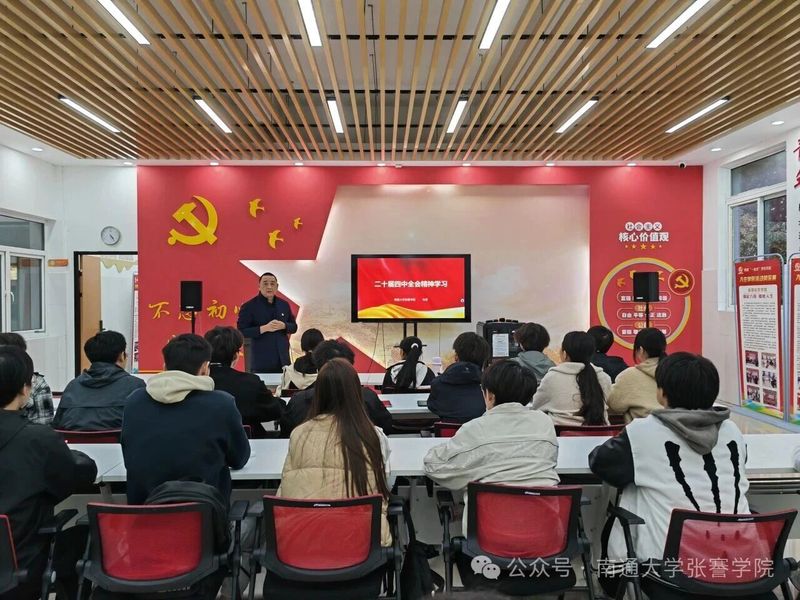 11月12日,张謇学院直属党支部书记、院长朱昱作了《二十届四中全会精神解读》专题授课。他从全会基本情况、召开背景、重大意义切入,解读“十五五”时期经济社会发展的指导思想、原则与主要目标,以详实的数据展现我国发展的 “坚实底盘”,用清晰的逻辑勾勒“十五五”时期的光明前景,让学员们真切感受到“国家发展与我有关”的责任感。